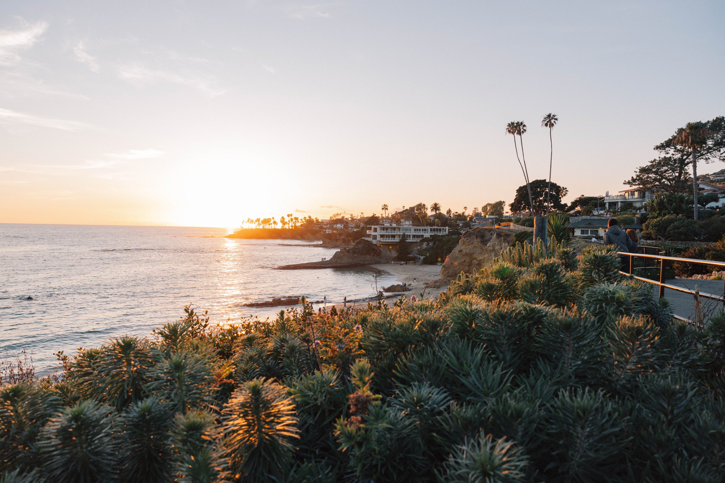 Laguna Beach at golden hour moves slowly — cliff houses catching the last light, wildflowers in the foreground, strangers on the sand becoming part of the landscape.